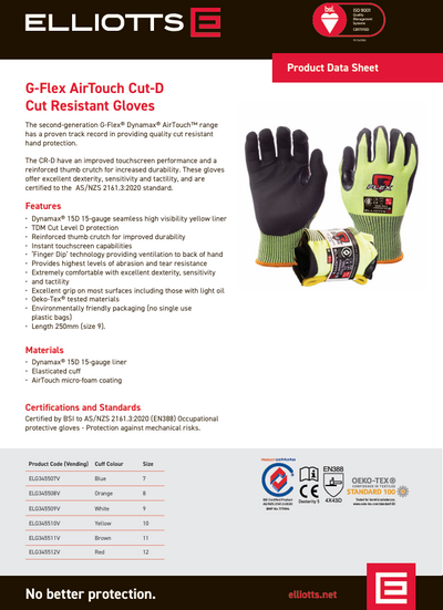 The second-Generation G-Flex® Dynamax® AirTouch range has a proven track record of providing quality, cut-resistant hand protection. The CR-D has an improved touchscreen performance and a reinforced thumb crutch for increased durability. These gloves offer excellent dexterity, sensitivity, and tactility and are certified to the AS/NZS 2161.3:2020 standard.